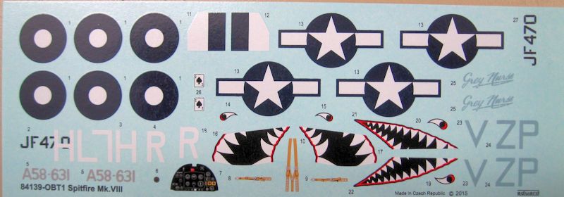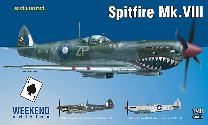 Vorbild: Die Supermarine Spitfire Mk. VIII wurde entwickelt, um die zusätzliche Leistung des Merlin der 60er-Serie optimal ausnutzen zu können. Sie war mit zahlreichen aerodynamischen Verbesserungen wie einem einziehbaren Spornrad ausgestattet. Weitere Merkmale waren eine stärkere Zellenstruktur, ein zusätzlicher Rumpftank und ein anderer Vergaserlufteinlauf mit Filter, wodurch die Mk. VIII tropentauglich und vor allem in Südostasien eingesetzt wurde, nur wenige flogen in Europa. Charakteristisch war auch das vergrößerte Seitenruder. Es verbesserte die Steuerbarkeit vor allem im Langsamflug und bei Start und Landung. Die meisten Mk VIII besaßen die normale Kabinenhaube und die C-Tragflächen mit zwei Kanonen und vier MGs. Es gab Versionen mit normalen und verkürzten Tragflächenspitzen. (Quelle Wikipedia)