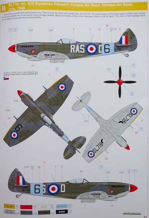 Vorbild: Die Spitfire Mk.XVI war mit der Mk.IX in den meisten Punkten mit Ausnahme des Motors, einem Merlin 266, identisch. Dieser Motor wurde auf der Basis des zweistufigen Merlin 66 konstruiert, und wurde ursprünglich für kanadische Mosquitoproduktion geplant. Wegen eines etwas höheren Ladeluftkühlers wurde eine neu gwölbte obere Verkleidung eingeführt. Die Bewaffnung der meisten Mk XVI bestand aus zwei 20 mm Hispano-Kanonen mit jeweils mit 120 Granaten und zwei Kaliber .50 Browning Maschinengewehre mit je 250 Patronen. Eine 227 kg Bombe könnte unter dem Rumpf mitgeführt, eine 114 kg Bombe könnte unter jedem Flügel angebracht werden.