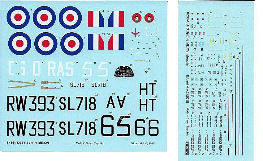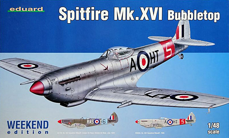 Bausatz: Eduard hat die Spitfire Mk.XVI als weekendausgabe veröffentlicht. Diese besteht aus vier grau gefärbten Gussästen mit ca. 180 Teilen, 11 Teilen an einem klaren Rahmen, Decals und der Bauanleitung. Mit dem Bausatz ist es möglich, eine Bubbeltop Variante zu erstellen.