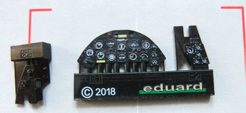 Neben der Hauptinstrumententafel befinden sich noch die nötigen Seitenkonsolen sowie das passende Gurtzeug für den Pilotensitz im Set. Das Material ist ein flacher, schwarzer Kunststoff, in dem die Uhren oder Armaturen scharf und genauestens geprägt und farbig wiedergegeben sind. Die Armaturen sind mit einer Schicht Klarlack versehen.