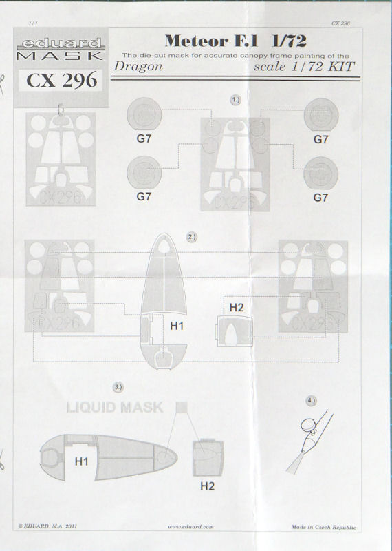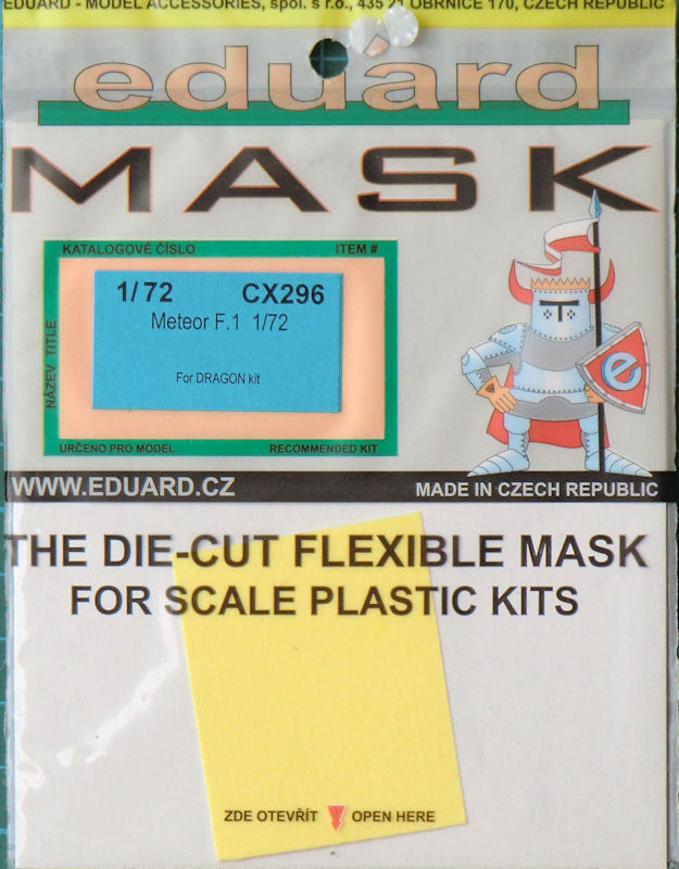 Für den Gloster Meteor F.1-Bausatz von cyber-hobby hat eduard ein Maskenset herausgebracht. Enthalten sind nicht nur die Masken für die Klarsichtteile, sondern auch für alle Räder. Die gewölbten Glasteile müssen mit Maskol nachbehandelt werden, denn es gibt sinnvollerweise nur die äußeren Ränder.