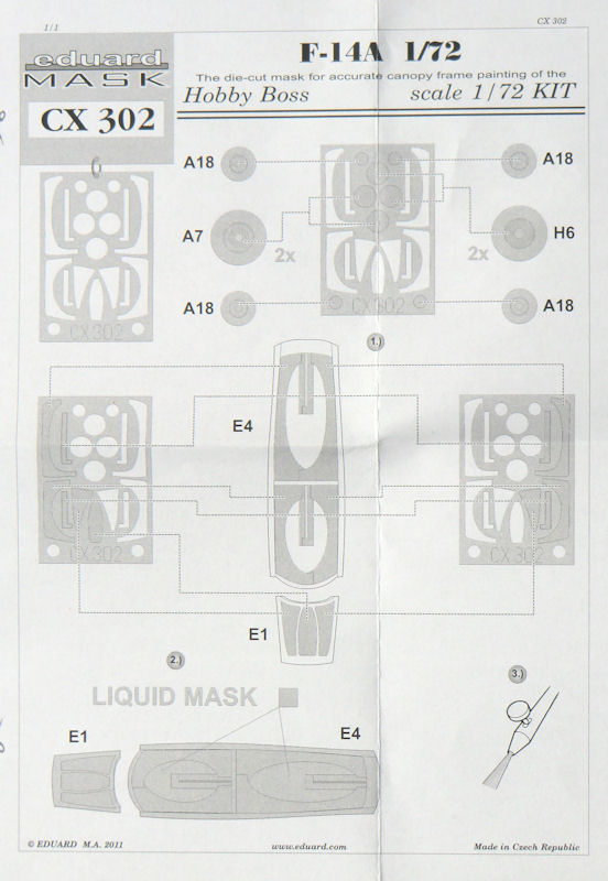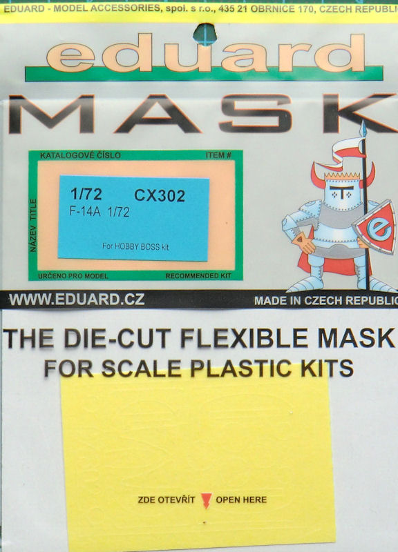 Für den HobbyBoss-Bausatz der Grumman F-14A Tomcat in 1/72 hat Eduard ein praktisches Maskenset herausgebracht. Damit können die beiden Klarsichteile und die Räder maskiert werden.