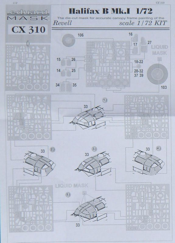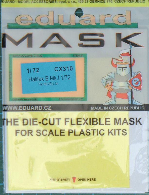 Für den recht gelungenen Revell-Bausatz der Halifax B.Mk. I hat eduard ein Maskenset herausgebracht. Enthalten sind nicht nur die Masken für alle Klarsichtteile dieser Version, sondern auch für die Hauptfahrwerksräder. Die große Blasenhaube muss mit Maskol nachbehandelt werden, denn es gibt sinnvollerweise nur die äußeren Ränder.