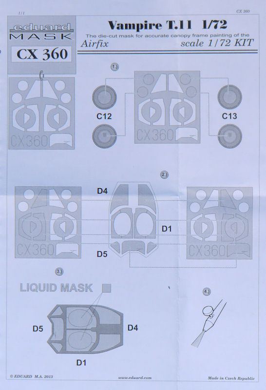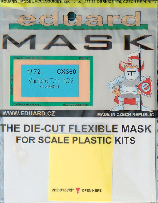 Für den 1/72 Bausatz der de Havilland Vampire T.11 von Airfix ist dieses Maskenset bestimmt. Dieses Set enthält einen gelben Bogen für die zwei Hauptfahrwerksräder und das Klarsichtteile der Trainer-Vampire.