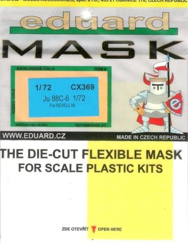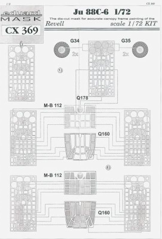 Für den gelungenen Bausatz der Junkers Ju 88C von Revell in 1/72 hat eduard ein Maskenset herausgebracht. Es enthält einen gelben Bogen für Räder und Klarsichtteile des Bausatzes. Das Set ist für beide Versionen der Ju 88C mit den unterschiedlichen Abwehrständen. Ein paar gewölbte Scheiben werden mit Maskol ausgefüllt.