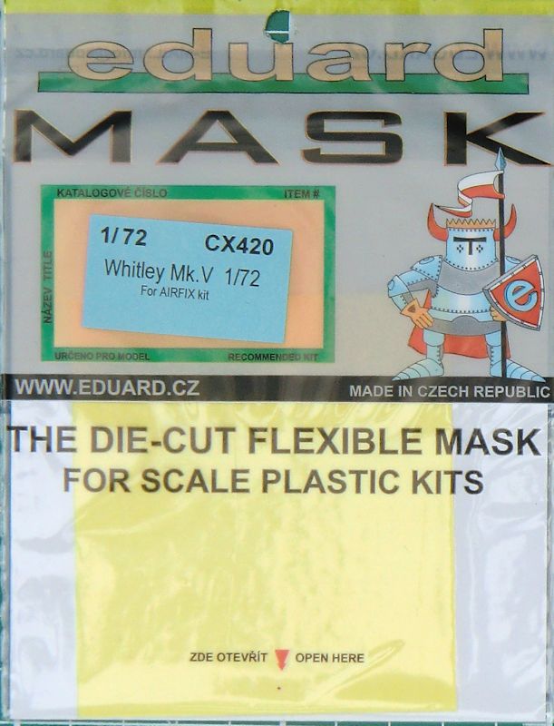 Für den neuen Bausatz der Armstrong Whitworth Whitley von Airfix hat eduard ein Maskenset herausgebracht. Es enthält einen gelben Bogen für die Kanzel und die Hauptfahrwerksräder des Bausatzes. Bei den ganzen kleinen Fenstern hat man jetzt nur noch die Fleißarbeit diese abzukleben.