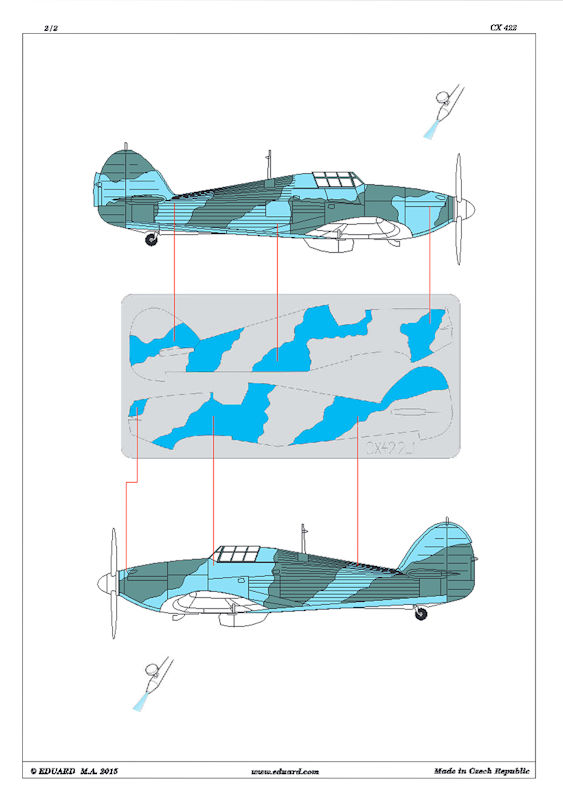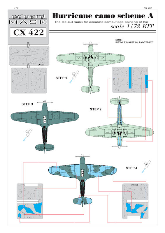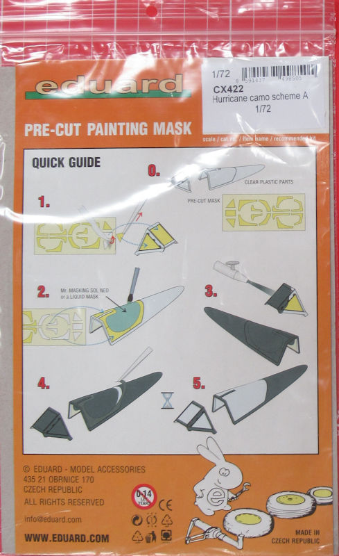 Für die verschiedenen auf dem Markt befindlichen Hawker Hurricane-Bausätze in 1/72 hat eduard ein Maskenset für den Tarnanstrich herausgebracht. Diese Maskenset enthält zwei gelben Bögen für die Rumpf und Tragläche sowie Höhenleitwerk des Bausatzes.
