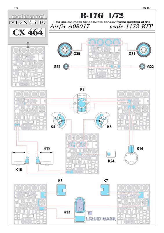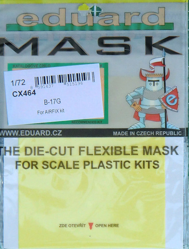 Für die Boeing B-17G von Airfix in 1/72 hat eduard ein Maskenset herausgebracht. Es enthält einen gelben Bogen für die Kanzel und die Fahrwerksräder des Bausatzes.