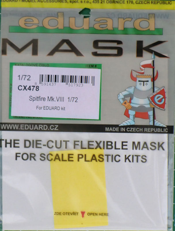 Für die hauseigene Supermarine Spitfire Mk. VIII bzw. den OVERTREES hat eduard ein Maskenset herausgebracht. Es enthält einen gelben Bogen für die Kanzel und die Fahrwerksräder des Bausatzes.