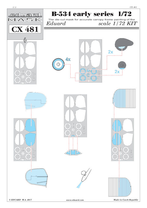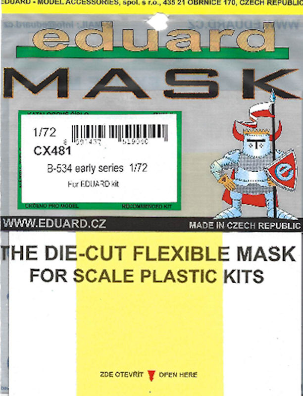 Für die neuen Bausätze der hauseigenen Avia B.534 hat eduard ein Maskenset herausgebracht. Es enthält einen gelben Bogen für die Kanzel und die Hauptfahrwerksräder des Bausatzes. Weiterhin gibt es Masken für das Höhenleitwerk, die Flügelspitzen sowie die Positionsleuchten..