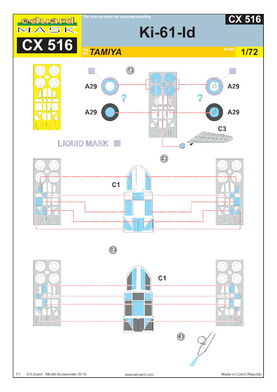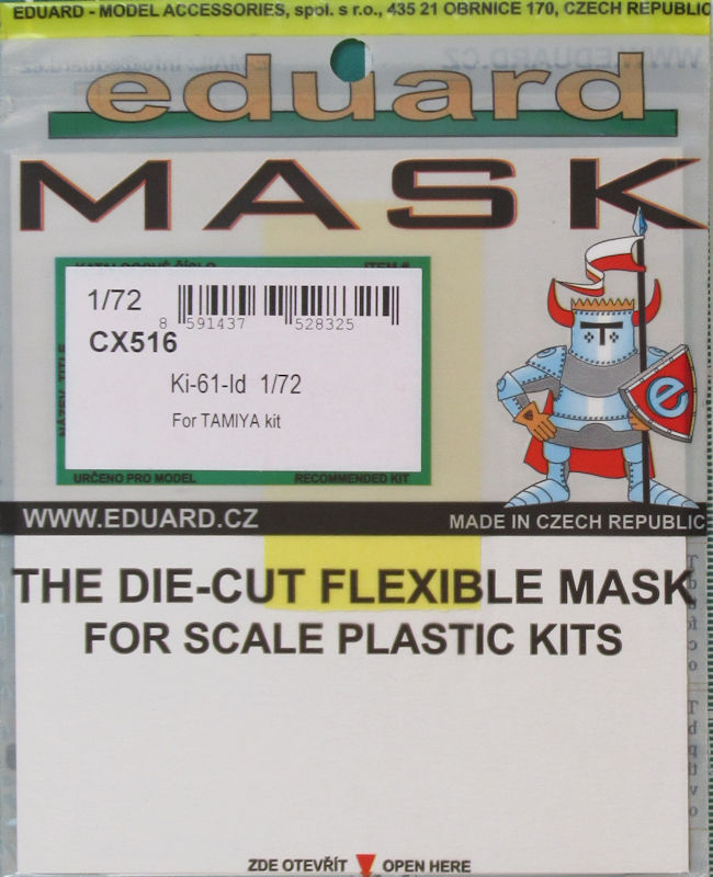 Für den Bausatz der Kawasaki Ki-61-Id von Tamiya in 1/72 hat eduard ein Maskenset herausgebracht. Dieses Maskenset enthält einen gelben Bogen für die Kanzel, den Landescheinwerfer und die Fahrwerksräder des Bausatzes.