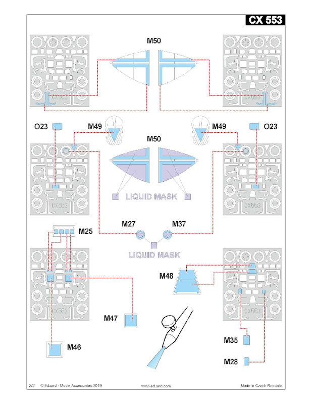 Die Qualität dieser Masken dürfte sich inzwischen schon herumgesprochen haben. Sie sind im Gegensatz zu den Vinylmasken leicht zu handhaben. Vor allem lassen sie sich auch rückstandsfrei entfernen. Auf zwei Seiten zeigt die Bauanleitung wo die Masken angebracht werden.