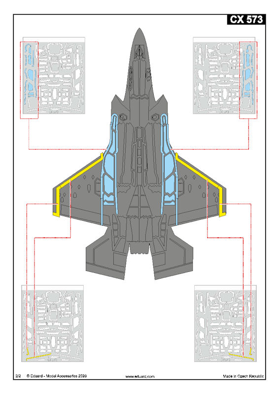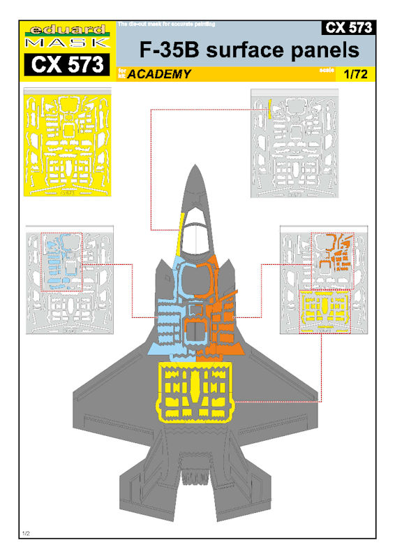 Für die ACADEMY F-35B in 1/72 hat eduard ein Maskenset herausgebracht. Diese Maskenset enthält einen gelben Bogen für die Ober- und Unterseite des Bausatzes. Damit lassen sich einzelne Abschnitte abkleben und damit die Oberfläche auflockern