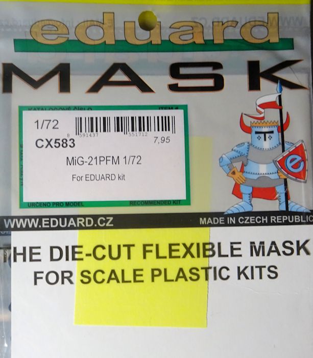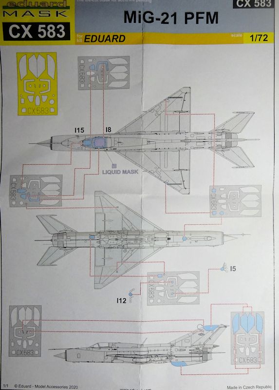 Passend zur WEEKEND edition der MiG-21PFM erscheinen mehrere Nachrüstsätze. Dazu gehören auch die bekannten Masken. Gerade für die gewölbten Hauben wie bei der MiG-21 sind sie eine Erleichterung für den Modellbauer. Eduard empfiehlt Maskol um einige Flächen abzudecken. Den gleichen Effekt erreicht man durch abkleben mit dem Reststreifen des Maskenbogens. Desweiteren gibt es welche für das Visier, die dielektrischen Abdeckungen und die Landescheinwerfer. Eine einfache Anleitung zeigt das Vorgehen und die Anbringung der Masken.