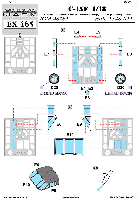 Zu meiner Überraschung hat Eduard für diesen Bausatz auch einige Sätze heraus gebracht. Natürlich kann der Bausatz von ICM (First Look) diese gut gebrauchen, aber es ist eben kein Kampfflugzeug. Am ehesten konnte man bei dem Verbindungsflugzeug noch mit einem Satz Masken rechnen. Dieser entspricht dem, was man so erwartetet. Die Passgenauigkeit der Masken ist bekanntlich sehr gut und mit diesem Satz kann man die Klarteile und die Felgen abkleben.