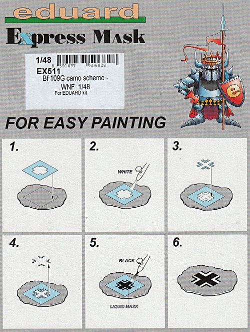 Eduard hat sich auch des Themas Masken für Tarnschemata angenommen. Bereits für die Hurricane I und Spitfire I von Airfix hatte man Masken herausgebracht. Nun gibt es auch für die eigene Bf 109G-Reihe verschiedene Standardtarnschemen. Man muss trotzdem noch ein wenig recherchieren, damit es für das gewählte Vorbild passt (Tupfen auf der Rumpfseite usw.). Mit diesem Maskensatz von Eduard kann man das Tarnschema nachempfinden, wie es bei den Wiener Neustädter Flugzeugwerken aufgetragen wurde. Die Wellenlinie an der Flügelvorderkante sitzt nach meiner Ansicht weiter vorn. Wie gesagt, zusätzliche Recherche ist unvermeidlich
