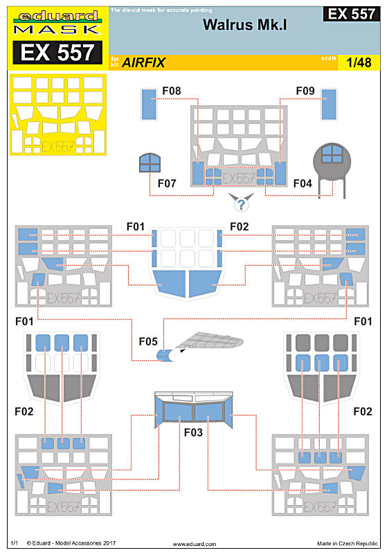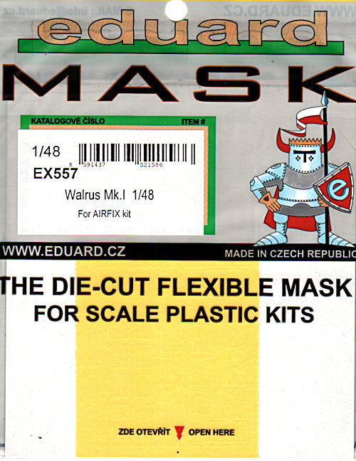 Für die Supermarine Walrus von Airfix (First Look) hat Eduard eine Reihe von Detail- und Zubehörsätzen herausgebracht. Das gros machen natürlich die Fotoätzteilsätze aus, derer es diesmal fünf gibt. Natürlich gibt es auch einen Maskensatz für die Klarteile des Bausatzes. Die Walrus hat recht viele plane Scheiben, daher ist dies kein Problem für das "Kabuki"-Klebeband und man braucht nicht mit Flüssigmaske herumzuhantieren. Die Anwendung erfolgt gemäß Anleitung (s.u.) und hält keine Überraschungen bereit.