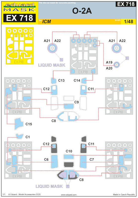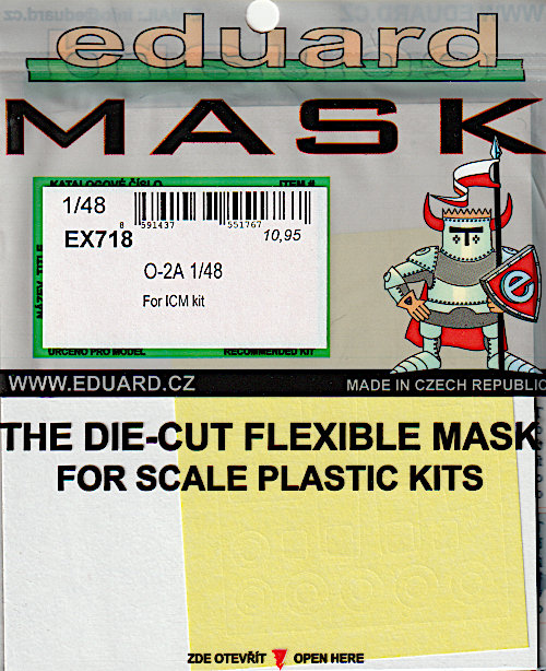 Für die Cessna O-2A von ICM bringt Eduard hier einen Maskensatz heraus. Die Masken sind wie immer aus dem gelben Material herausgeplottet. Der Satz erscheint in der kleinen Standardverpackung und umfasst Klebefolien für die Außenseite aller Scheiben und dies sind bei dem kleinen Flugzeug garnicht so wenige. Die Anleitung umfasst eine Seite, was trotz Fülle ausreichend ist.