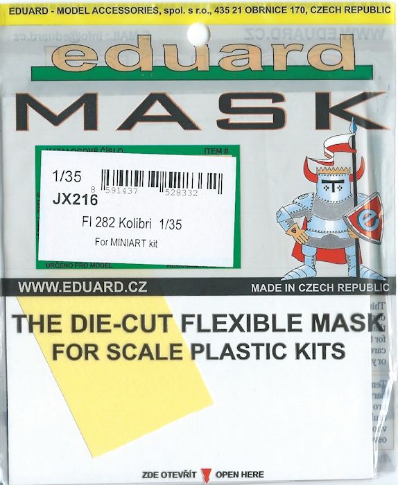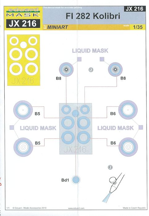 Den Abschluss der Update Sets von Eduard für den Fl 282 Kolibri von Miniart bildet ein Maskier Satz. Die auf flexiblem Material bereits vorgeschnittenen Masken sind ausschließlich für die Erleichterung der Reifenbemalung enthalten.