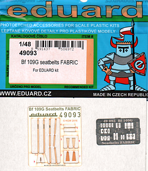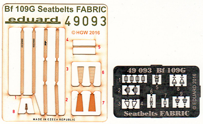 Für die eigen Messerschmitt Bf109G hat Eduard eine ganze Reihe von Zubehörsets herausgebracht. Neben den meist auf den Zoom-Sätzen enthaltenen Fotoätzteilgurten bietet Eduard noch zwei weitere Produkte für die Darstellung der Sitzgurte an. Die High-Tech-Lösung "fabric" und Low-Tech "super fabric", wobei sich die Unterscheidung eher auf die Verwendung als auf die Produktion bezieht.