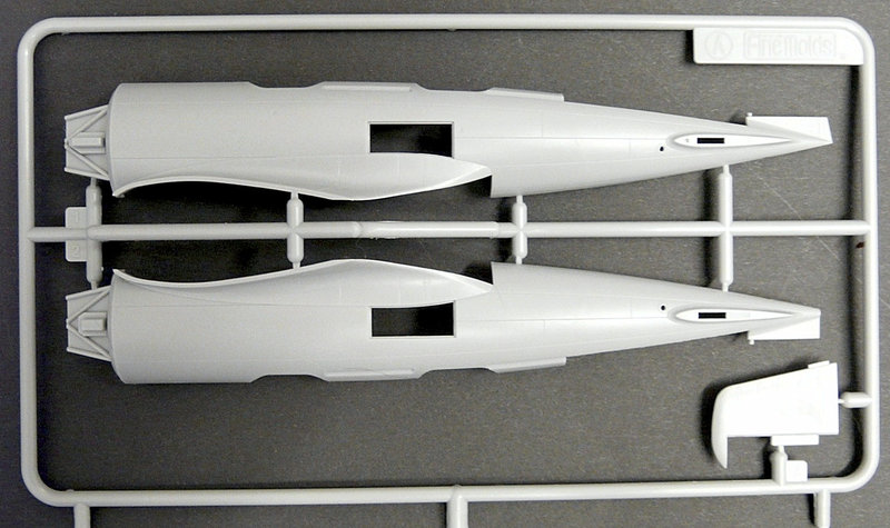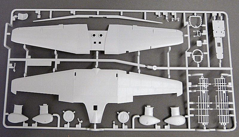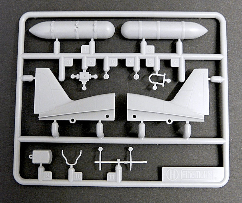 Die Tragflächen sind grundsätzlich zweiteilig ausgeführt worden. Das Oberseitenteil weist im Mittelteil Montagehilfen für den Cockpitboden auf, was zu einer sehr stabilen Verbindung führen wird. Stabil wird auch die Tragfläche selber sein, denn Fine Molds hat an einen Flächenholm gedacht, der auch den korrekten Anstellwinkel der äußeren Tragflächen sicherstellt. Löblich! Anders als bei den meisten Flugzeugmodellen dieser Größe in 1:48, ist der Landescheinwerfer als separates Bauteil erstellt worden, das mit einem extra Klarsichtteil abgedeckt wird. Prima!