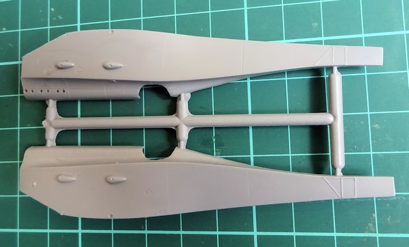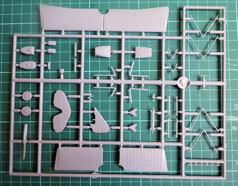 Bausatz: Das 2013 erstmals erschiene Spritzgussmodell ist das einzige in diesem Maßstab. In der Box befinden sich zwei Äste aus gelbbraunem Kunststoff, ein einteiliger Sitz / Cockpit aus Resin, eine vakuumgeformte Windschutzscheibe und Abziehbilder. Die Qualität der Spritzgussteile ist sehr ansprechend, die Details, wie Z.B. der Stoffeffekt auf den Flügeln wurden sehr gut wiedergegeben. Der zu beseitigende flash ist kaum der Erwähnung wert. Die Angüsse sind allerdings produktionsbedingt etwas dick und erfordern besondere Sorgfalt beim Abtrennen.