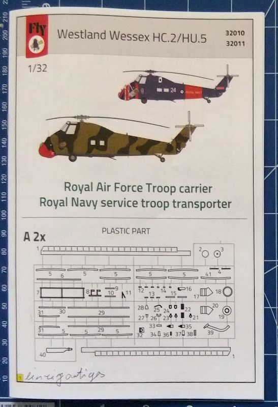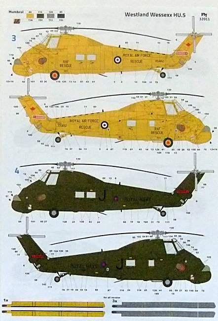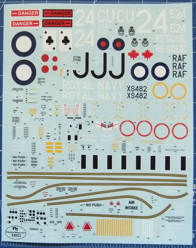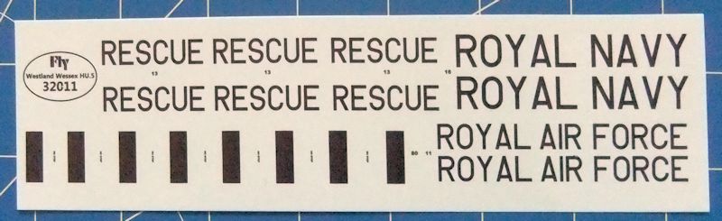 Der große Decalbogen erlaubt erst einmal eine von vier vorgeschlagenen HU-5 Wessex Helikoptern, wie sie die britische Royal Navy verwendet. Allerdings liegen dem Bausatz auch die notwendigen Teile bei, um eine Wessex HC.2 der Royal Air Force zu erstellen. Der Decalbogen hat aber nur die Kennungen für die Navy Variante. Nur den Schriftzug Royal Air Force gibt es und auch den passenden Anti-Rutsch-Belag auf dem Rumpfrücken.