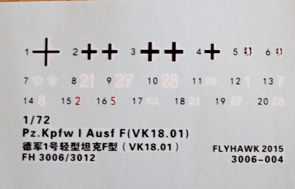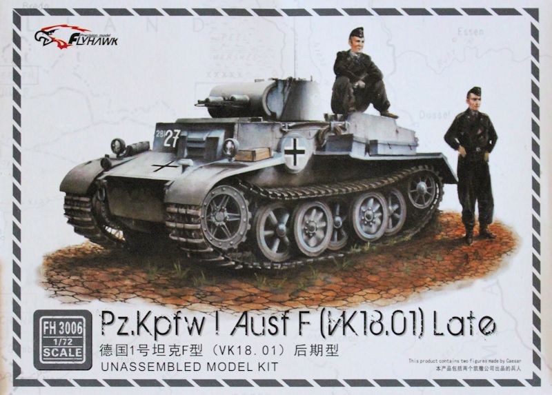 Bausatz: Die chinesische Firma Flyhawk hat das Modell "VK 1801" herausgebracht. In der kleinen, schön gestalteten Schachtel befinden sich drei große hellgraue, sechs kleine hellgrau, zwei schwarze Gießrahmen für die Ketten, der Rumpf, etwas Zwirn, eine Fotoätzplatine, Abziehbilder, ein auf Karton gedruckter Ausschnitt einer Pflasterstraße sowie eine sehr übersichtliche Bauanleitung.