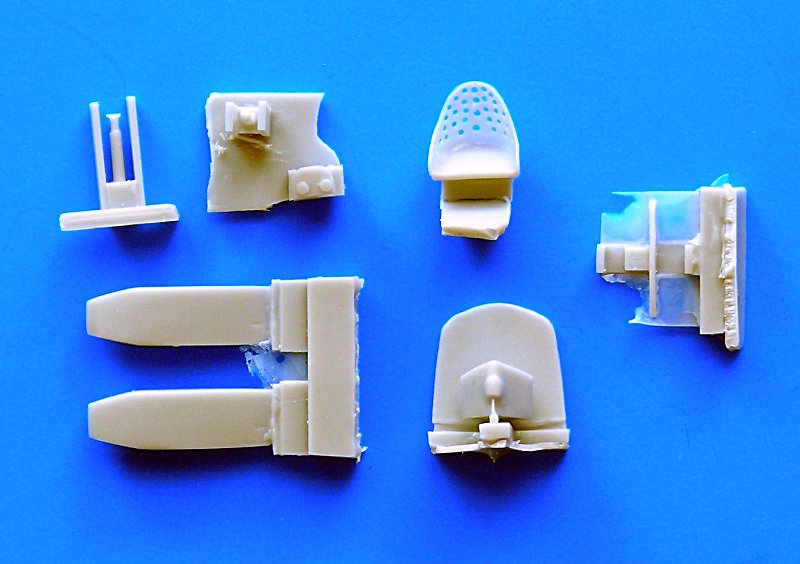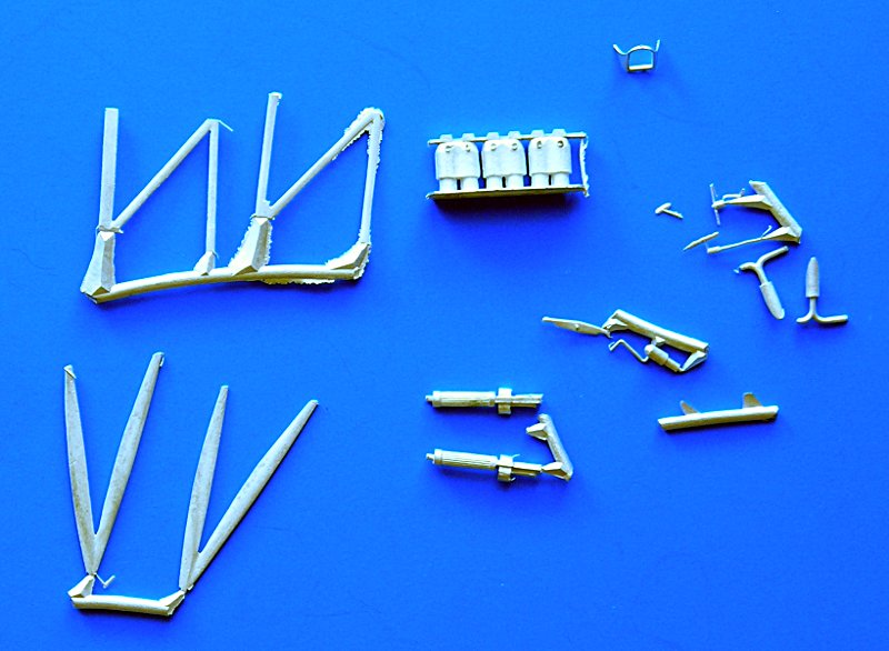Gleich vorweg sei gesagt, dass dies ein wirklicher Short-run Bausatz ist. Die Spritzgussteile sind im low-pressure Verfahren abgespritzt, haben etwas Grat und sehen auch etwas seltsam (marmoriert) aus – was aber bei näherer Betrachtung lediglich eine unregelmäßige Einfärbung des Plastiks ist. Die Passgenauigkeit ist mäßig. Außerdem müssen Resin und Weißmetallteile von Angüssen getrennt, versäubert und angepasst werden. Auch um Eigeninitiative bei Verstrebungen und Details kommt man nicht herum. Die Bauanleitung ist eher übersichtlich, wie auch die Teileanzahl, weshalb dies kein Problem ist. Außerdem gibt es textliche Ergänzungen in Englisch und eine Reihe von Vorlagen und Perspektivischen Darstellungen für die selbst anzufertigenden Streben. Das Material dafür liegt bei.