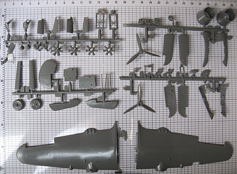 So gibt es hier, neben einem Klarsichtteil für den Landescheinwerfer, diesmal zumindest auf den Außenseiten der einteiligen Räder ausgeformte Felgen-Details. Die in diesem Fall sogar weitgehend dem Original entsprechen. Auch die Doppel-Sternmotoren wurden, wie bei Frog üblich, mithilfe zweier Teile nachgebildet. Ferner entspricht hier der Aufbau der Hauptfahrwerksbeine ebenfalls im Großen und Ganzen dem Vorbild, was bekanntlich leider nicht auf alle Frog-Bausätze zutrifft.