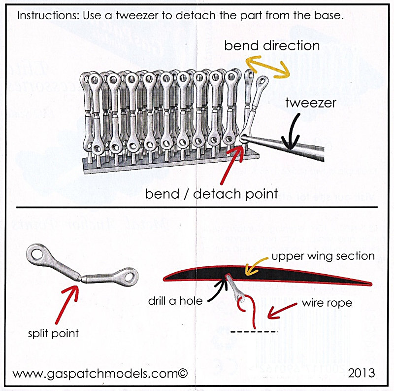 Detailsatz: Für die Verspannungen an Flugzeugen sind natürlich nicht alleine Spannschlösser von Nöten, sondern auch die starren Gegenpunkte am anderen Ende. Bedenkt man die "Größe" dieser Teile kann man durchaus auch mit selbstgezwirbelten Ankern aus Kupferdraht arbeiten. Die sind schließlich auch recht schnell hergestellt und wenn erstmal Farbe drauf ist...