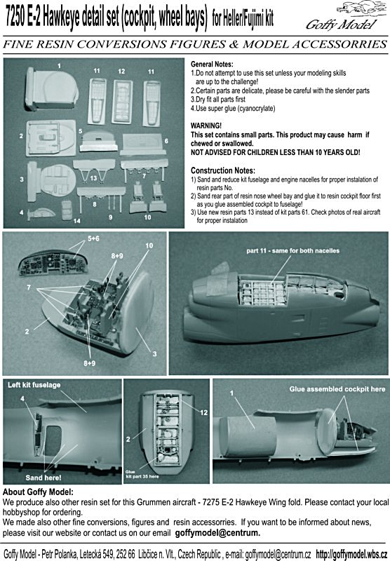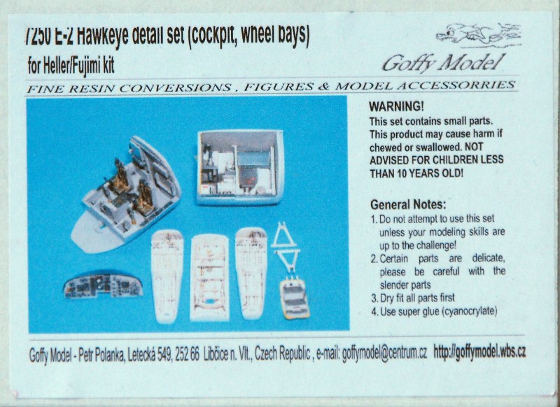 Für die Grumman E-2 Hawkeye Bausätze von Fujimi und Heller hat Goffy Model aus Tschechien ein Detailset herausgebracht. Es beseitigt die Schwachpunkte der beiden Bausätze. Da Hasegawa-Bausätze traditionell innen auch recht einfach gestaltet sind, kann es ggf. auch dort benutzt werden.