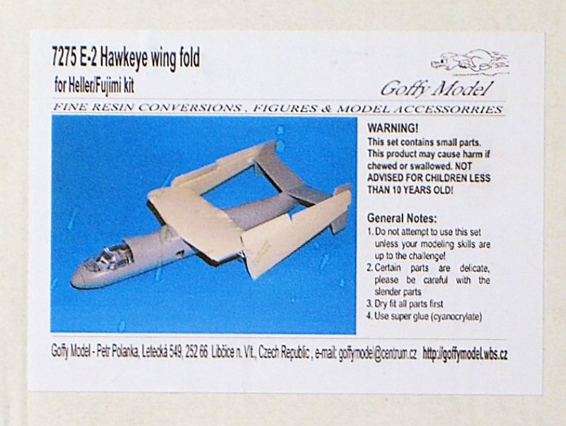 Für die Grumman E-2 Hawkeye Bausätze von Fujimi und Heller hat Goffy Model aus Tschechien ein Set herausgebracht welches den Bau dieses Modells mit einer gefalteten Tragfläche ermöglicht.