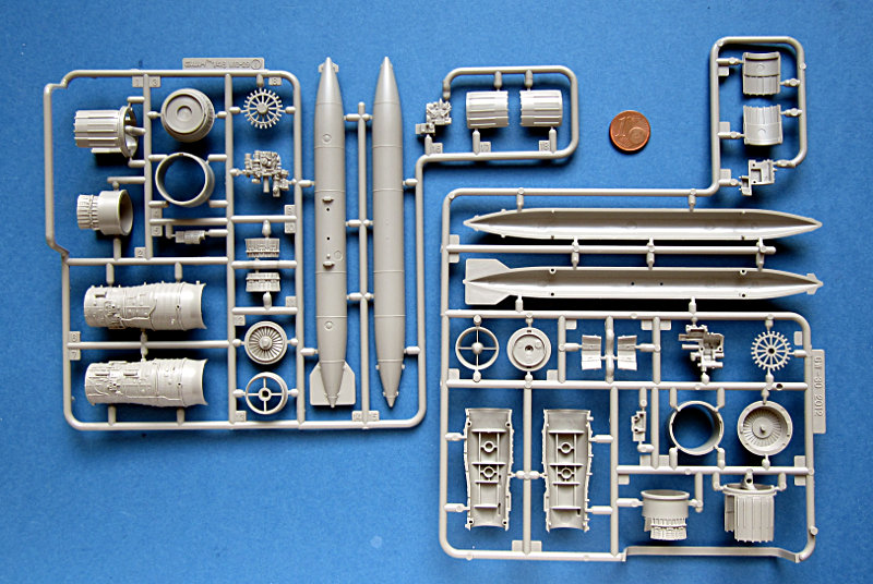 Doch zurück zum Guten im Karton. Nach dem Öffnen versperrt zunächst ein weiterer Karton den weiteren Einblick. In diesem befindet sich die obere Rumpfhälfte die so gegen Verformung und Kratzer geschützt wird. Darunter findet sich gleich eine Weitere Besonderheit der GWH Bausätze. In einem Plastikblister sind 6 Luft-Luft-Raketen einzeln verpackt. Selbige sind „am Stück“ mittels slide mold gefertigt worden. Es stehen je zwei R-60, R-73 und R-27R zur Verfügung. Übrigens lässt sich aus dem Bausatz auch der Späte Untertyp der 9-12 bauen. Insgesamt dürfte es gut sein, das eigene Vorbild gut zu recherchieren, da die Übergänge zwischen den Varianten fließend waren und oft Nachrüstungen stattgefunden haben.