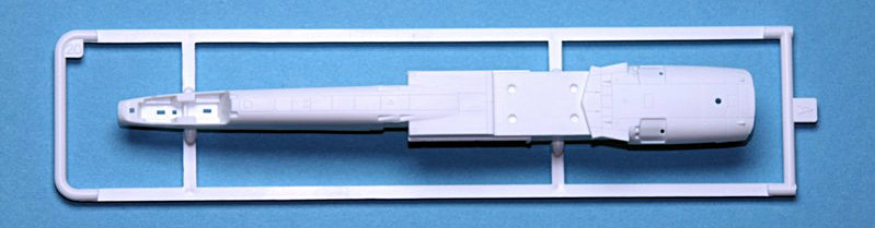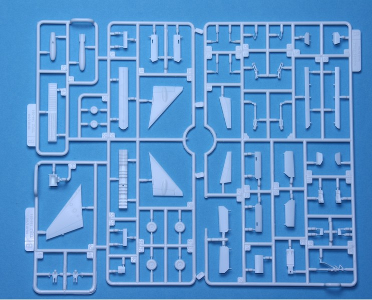 Nach meiner Zählung sind es 80 Teile, welche in weißen Kunststoff abgespritzt wurden sowie fünf in klaren Plastik sowie zwei schwarze für den Ständer. Der Rumpf ist zweiteilig in einer Ober- und Unterschale ausgeführt. Die Oberflächen sind zeitgemäß mit feinen Gravuren detailliert, optional kann man die beiden Paare der Luftbremsklappen in geöffneter Stellung montieren. Das Cockpit ist eher einfach gehalten, zur Ausstattung des Kits gehören auch zwei Pilotenfiguren. Decals zur Darstellung der Instrumentenbretter gibt nicht. Durch die eher kleine Verglasung ist später bestimmt aber auch nicht soviel erkennbar.