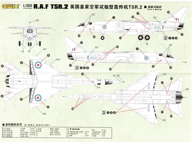 Die Bauanleitung ist in A4 Größe gedruckt und führt in 15 Schritten zum fertigen Modell. Dies in einer verständlichen und übersichtlichen Art und Weise. Bei meinem Bausatz waren allerdings die Hinweise bei einzelnen Schritten und Optionen in Chinesisch geschrieben. Der erfahrene Modellbauer hat damit aber sicherlich keine Probleme. Im Internet fand ich einen Tipp, dass man die beiden Luftansaugschächte A4 und A5 zuerst an den Rumpf kleben sollte und nicht die Tragflächen, da dies zu Passproblemen führt. Die Bemalungs- und Abziehbilderanleitung ist farbig auf einer DIN A4 Seite dargestellt. Farbangaben beziehen sich auf das System von Gunze GSI Creos. Der kleine Decalbogen ist matt gedruckt und erlaubt den Bau der drei Prototypen XR219, XR220 und XR222.