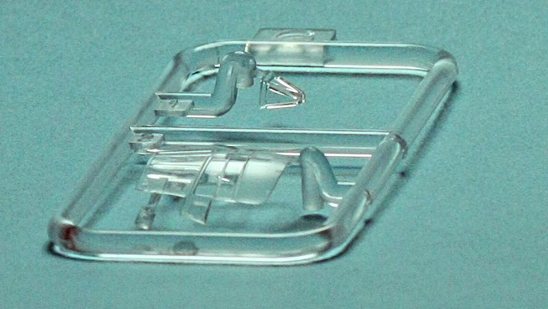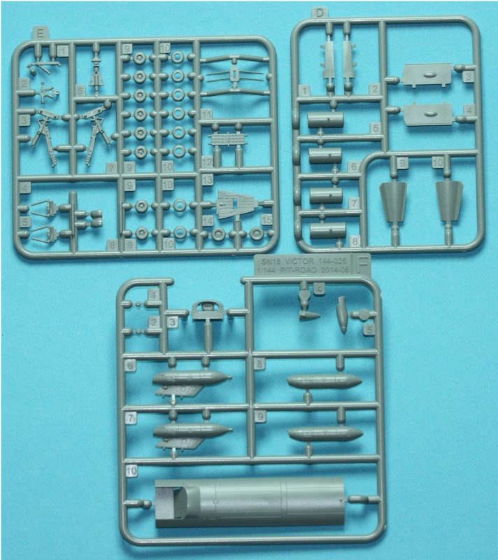 Sehr gut gelungen sind auch die offenen separaten Lufteinlässe, welche auf der Unterseite geklebt werden. Vor dem Zusammenfügen der oberen und unteren Hälften sind noch vier Löcher für die Betankungspods zu bohren. Diese und noch die anderen spezifischen Teile für die Tankerversion finden wir auf dem neuen, zusätzlichen Spritzling F. Auch hier ist kein Abfall in der Qualität gegenüber dem restlichen Bausatz zu verzeichnen. Die beiden Tanksondenkörbe sind extra. Hier ist also schon vorgesorgt für eine Darstellung im Flug mit "Kunden" zum Nachfüllen. Interessanterweise verfügt die Bombenschachtklappe auch über die Möglichkeit eine Öffnung für einen Ständer zu öffnen. Dieser ist jedoch nicht im Bausatzumfang enthalten. Die Fahrwerksteile bieten auch keinen Ansatz für Kritik. Dies gilt auch für die Klarsichtteile. Glasklar und sehr sauber in der Darstellung der Streben. Man könnte höchstens das Fehlen der Aufdickungen an den äußeren Seiten der äußeren Fenster monieren. Aber dies ist Meckern auf höchstem Niveau.