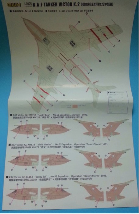 Die glänzend gedruckten Decals machen einen guten Eindruck und liefern auch die zahlreichen Warn- und Positionsstreifen für die Tankervariante. Der Bau der folgenden Maschinen ist möglich: