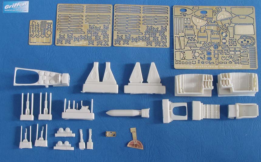 Als Ergänzung hierzu bietet Griffon nun einen Detailsatz. Dieser umfasst 4 unterschiedlich große Ätzplatinen und knapp 30 Resinteile. Dabei dienen diese nicht wie üblich der Detaillierung vorrangig des Cockpits sondern eher der äußeren Bereiche, wie z. B. der Fahrwerkschächte, der Außenwaffen samt Aufhängungen und (doch noch?) des Waffenstandes mit dem Zwillling-MG am hinteren Cockpit sowie einiger anderer Kleinigkeiten.