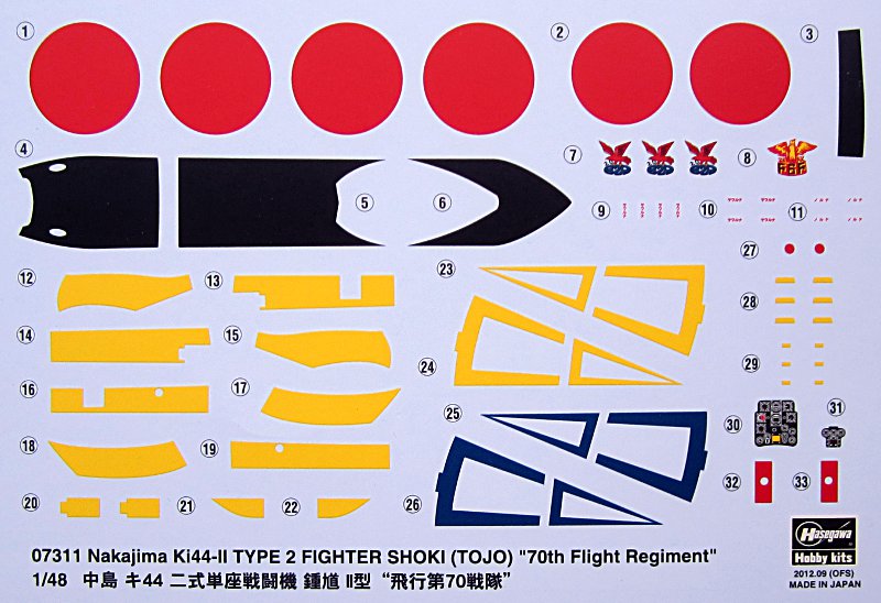 Neu sind die Bemalungsvarianten des Bausatzes. Hier können zwei Flugzeuge der 70. Sentai dargestellt werden, nicht jedoch die bekannten Asse Ogawa oder Yoshida sind hier enthalten, sondern zwei andere Piloten. Diese haben aber trotzdem sehr bunte Erfolgsmarkierungen an Ihren Ki44.