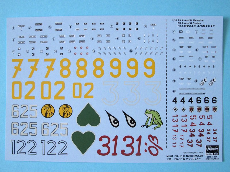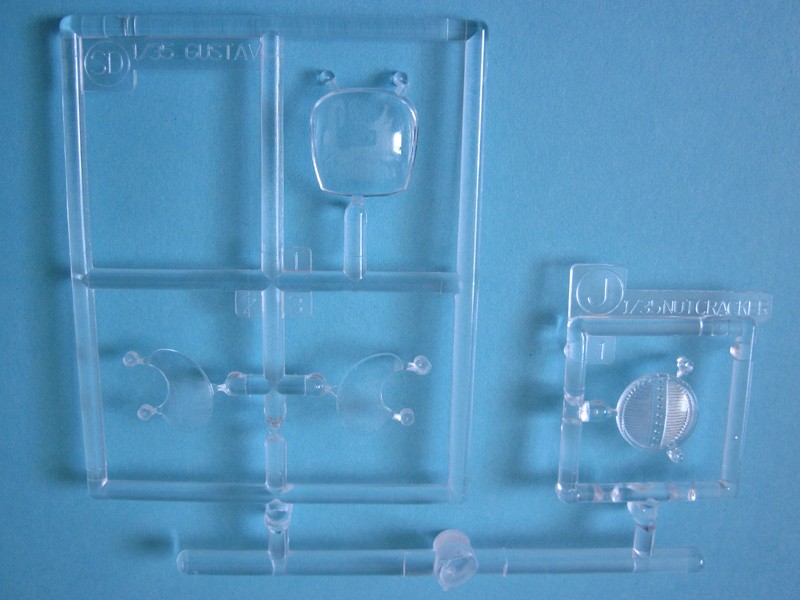 Der Bausatz enthält weiterhin Klarsichtteile, PE-Gelenkmuffen, zwei separate Bauanleitungen für Nutcracker und Kampfanzüge, die beliebte Sammelkarte mit den Tarnschemen diverser SDR Einheiten und einen sauber gedruckten Decalbogen mit Markierungen für mindestens vier verschiedene Fahrzeuge. Auf dem Karton selbst finden sich alle wichtigen Daten zum Modell sowie ein kurzer „geschichtlicher“ Abriss über Entwicklung und Einsatz in englischer Sprache.