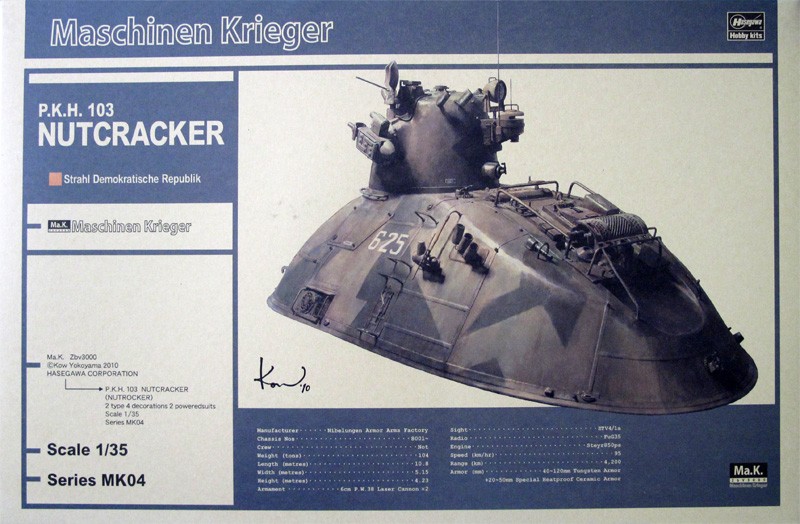 Bausatz: Hasegawa liefert mit dem Nutcracker einen weiteren Traum aller Maschinen Krieger Fans in Plastik ab. Zehn Spritzlinge enthalten satte 333 Teile zum Bau des Schwebepanzers sowie zwei Kampfanzüge im passenden Maßstab. Die Qualität der Details und Oberflächen ist hervorragend ausgeführt, die kleinen Anzüge ein Traum. Allein hier hat man mehrere Optionen beim Zusammenbau, da zwei Pilotenköpfe, zwei Waffen und verschiedene Hände beiliegen.