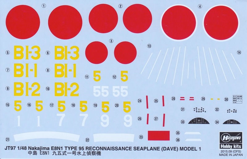Der Decalbogen liefert Decals für die Instrumentenbretter und für zwei Maschinen aus dem japanisch-chinesischen Krieg. Die eine gehörte zum Schlachtschiff Kirishima, die andere zum Seeflugzeugtender Kamoi. Beide tragen den für diese Zeit typischen Anstrich bestehend aus Hellgrau, Braun und Grün. Decals für Beschriftungen des Slipwagens, wie man sie auf allen mir bekannten Fotos erkennen kann, sucht man allerdings vergebens.