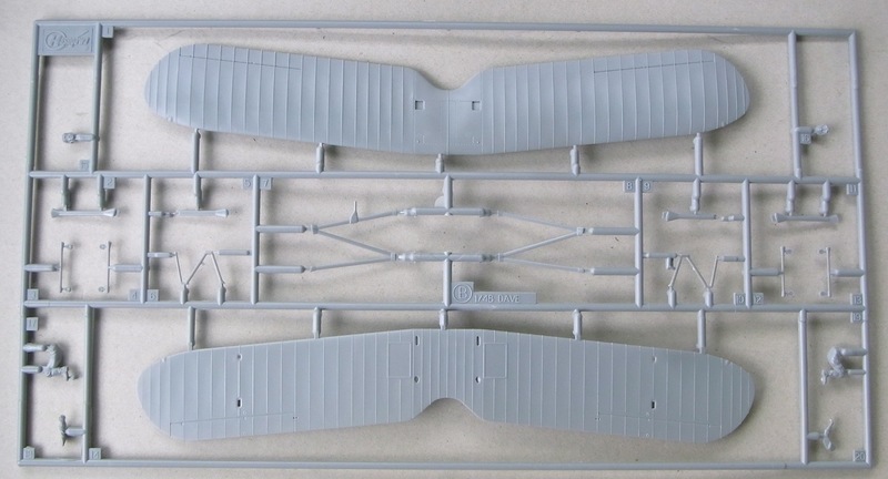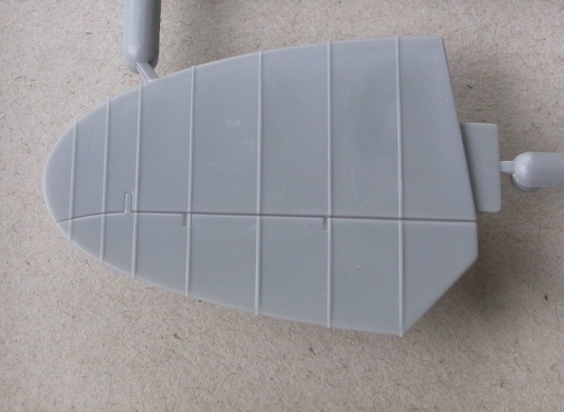 Die Trag- und Steuerflächen weisen leider eine übertriebene Rippenstruktur auf. Anfangs vermutete ich Rippenverstärkungen aus Aluminiumstreifen, aber selbst in diesem Fall wäre die Darstellung zu extrem, denn keines der mir bekannten Fotos zeigt eine derart "grobe" Rippung! Man wird also entweder damit leben oder sich ein Lösung, wie zum Beispiel vorsichtiges und nicht vollständiges abschleifen, vornehmen müssen.