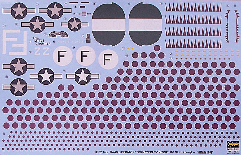 Bausatz: Hasegawa hat sich hier mal zwei recht ungewöhnliche Vorbilder angenommen. Die Bausatzteile entsprechen der schon vorgestellten normalen Version. Nur Bauanleitung, Decals und Kartoncover wurden neu gestaltet. Im Prinzip wird beim Bau nur die Bewaffnung weggelassen und das Modell farbenfroh bemalt oder/und mit Decals versehen. Entgegen der Bauanleitung sollte man den Bombenschacht im geschlossenen Zustand bauen, denn bekanntlich waren diese bunten B-24 unbewaffnet.