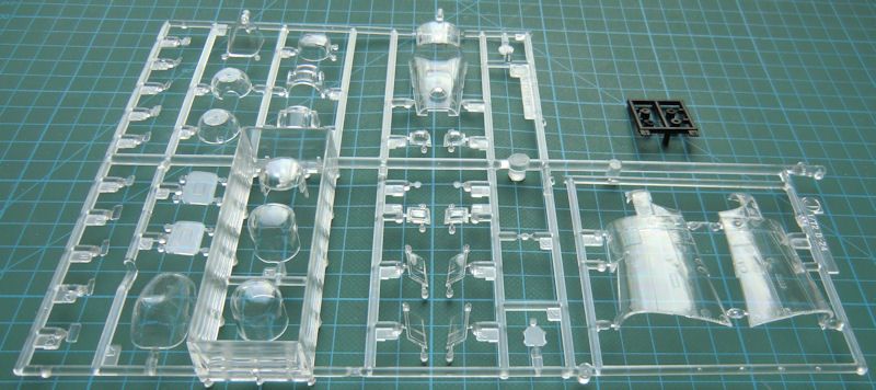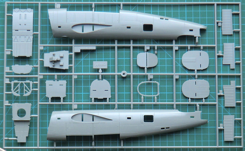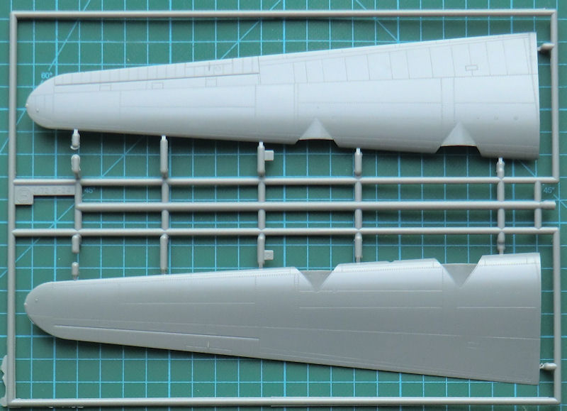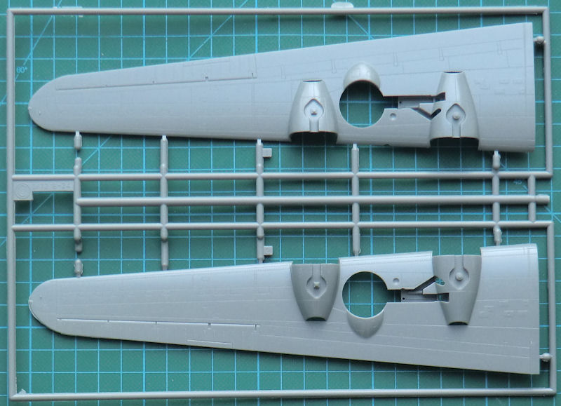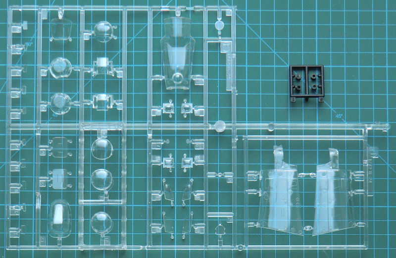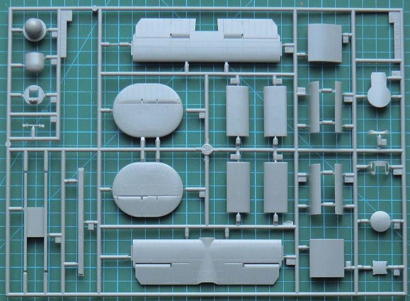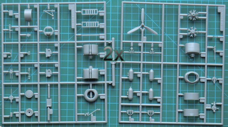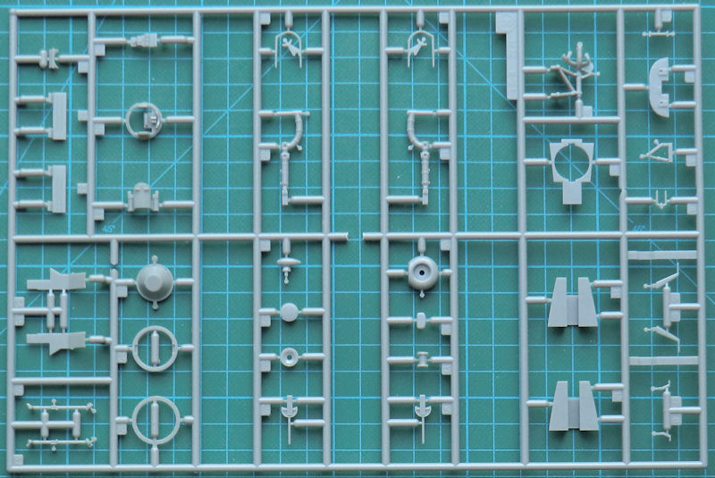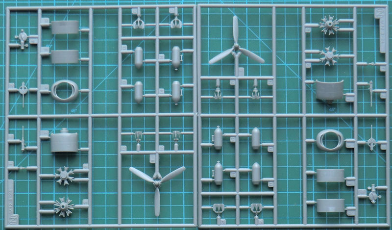Die Waffenstände sind im üblichen Hasegawa-Niveau gehalten. Wer Zeit und/oder Geld hat, der kann noch einige Details hinzufügen. Bei den Hauptfahrwerksrädern gibt es abgeplattete Räder. Die Triebwerke bestehen je aus zwei Sternen und sind ausreichend detailliert. Übrigens sollen 90g im Bug als Gegengewicht platziert werden. Da hilft wohl nur Bleischrot.