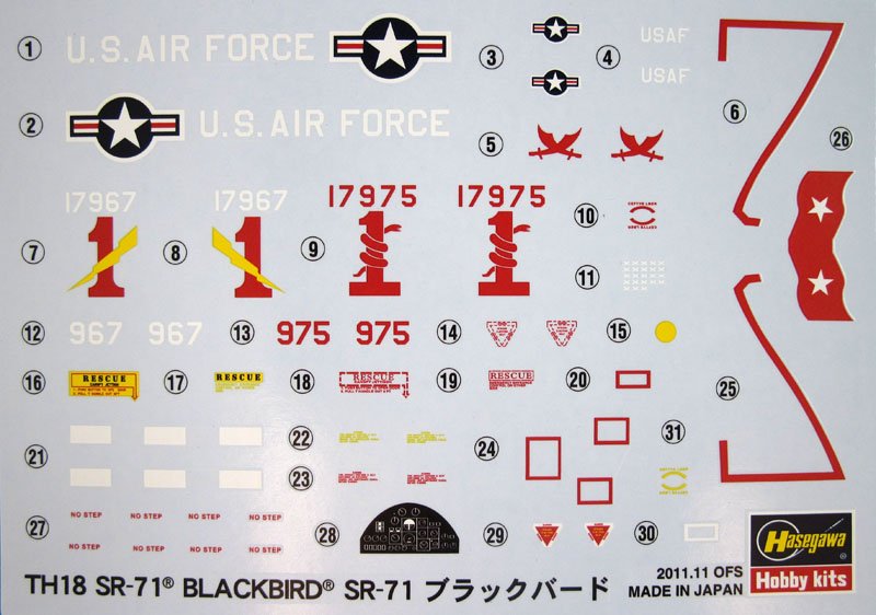Ein sauber und versatzfrei gedruckter Decalbogen enthält Markierungen für zwei Maschinen der US Airforce. Für ein Fun-Kit ist der Bogen erstaunlich umfangreich.