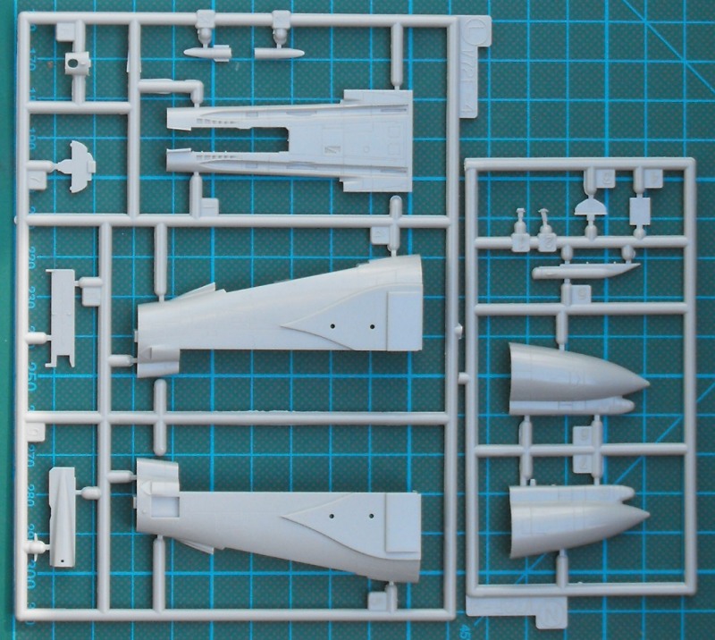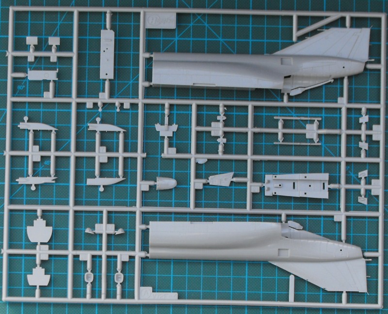 Für die heutigen Ansprüche ist das Cockpit etwas schwach detailliert. Hier gibt es kaum Strukturen, sondern die Instrumente werden mittels Decals dargestellt. Wer noch ein wenig Geld für Zubehör ausgeben möchte, der kann u.a. in Schleudersitze investieren. Hasegawa weist beim Zusammenbau nicht auf ein Buggewicht hin. Dieses sollte keiner vergessen. Die Cockpitverglasung kann alternativ in geöffneter oder geschlossener Postion montiert werden. Ansonsten gilt gut in die Bauanleitung schauen und vorm Zusammenbau keine Bohrung vergessen. Wer Lust hat, der kann noch Schubdüsen von AIRES montieren oder einfach die Teile aus dem Bausatz gut bemalen.