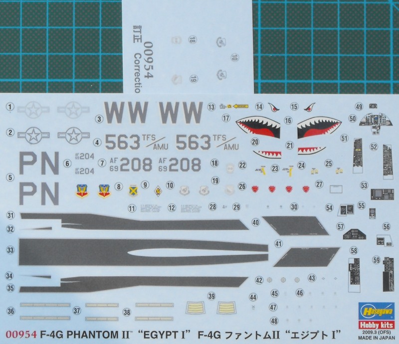 Eigentlich gibt die Bauanleitung keine Rätsel auf. Es gibt auch eine schöne Tabellen, in der die Bewaffnungskombinationen erklärt sind. Die Decals sind ohne Versatz auf hellblauem Trägerpapier gedruckt. Übrigens bezeichnet "Egypt I" das Tarnschema. Bei den Bemalungshinweisen vermisse ich allerdings eine Jahresangabe.