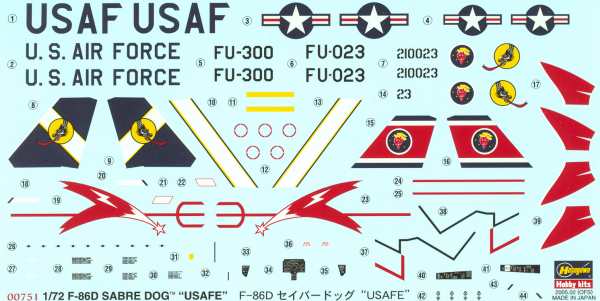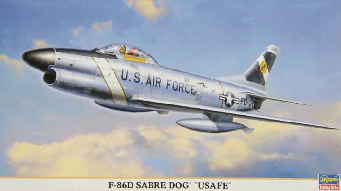 Vorbild: Die F-86 Sabre Dog war der erste Allwetterjäger der Firma North American und basierte auf der F-86A. Der Erstflug der noch YF-95A genannten Maschine war am 22. Dezember 1949. Die neue Bezeichnung wäre sicherlich berechtigt gewesen, handelte es sich doch fast um eine Neukonstruktion. Das wesentliche Unterscheidungsmerkmal zu den bisherigen F-86 Baureihen war der Rumpfbug mit Radardom und die Bewaffnung mit Raketen. Die Gesamtzahl der bestellten Maschinen erreichte die stolze Zahl 2504. 1955 waren 20 Geschwader der USAF mit diesem Typ ausgerüstet. Nach einer gründlichen Ausbildung der Piloten, konnte die F-86D als sehr effektives Waffensystem eingesetzt werden. Ab 1958 wurde die F-86D auch exportiert. Für die NATO - Verbündeten wurde eine entfeinerte Version mit vier Kanonen entwickelt. Es war die F-86K, die bei Fiat montiert und später auch produziert wurde.